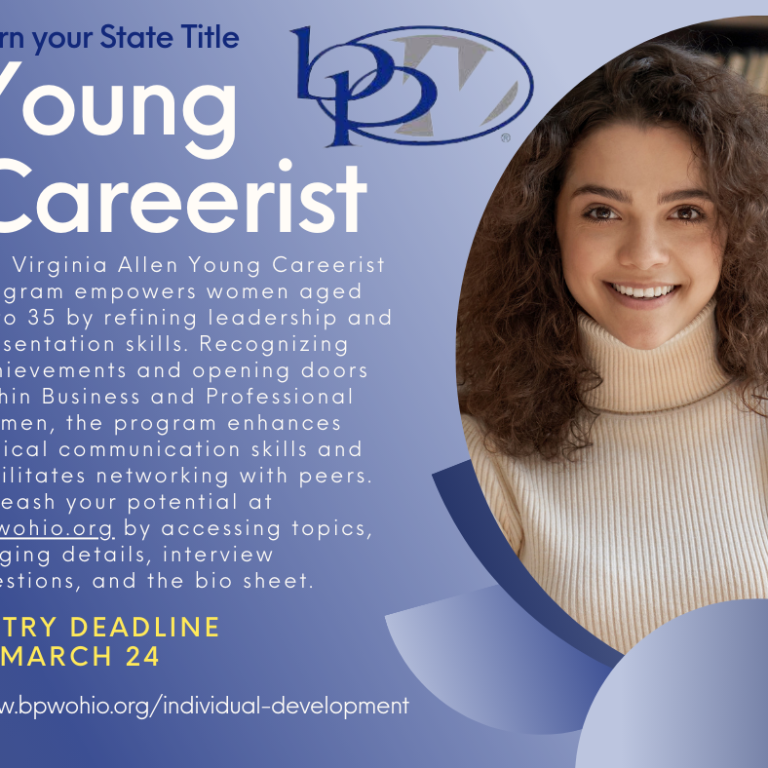 Candidates must also have been employed for at least 1 year in a full time job or a student full time. Candidates must believe in the BPW OHIO Legislative Platform.